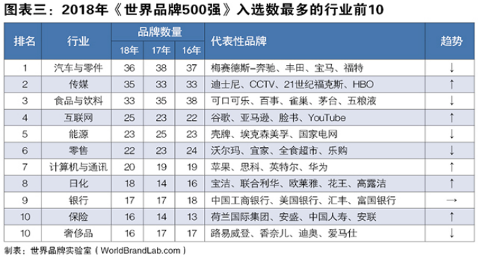 今年《世界品牌500强》共覆盖了57个行业。其中,汽车与零件行业共有36个品牌入榜,排名继续保持第一; 传媒行业今年上榜了35个品牌,位居行业第二;食品与饮料行业继续下滑,以33个品牌退居第三;互联网行业继续保持上涨的势头,以25个品牌超过能源行业(23个)排名第四。