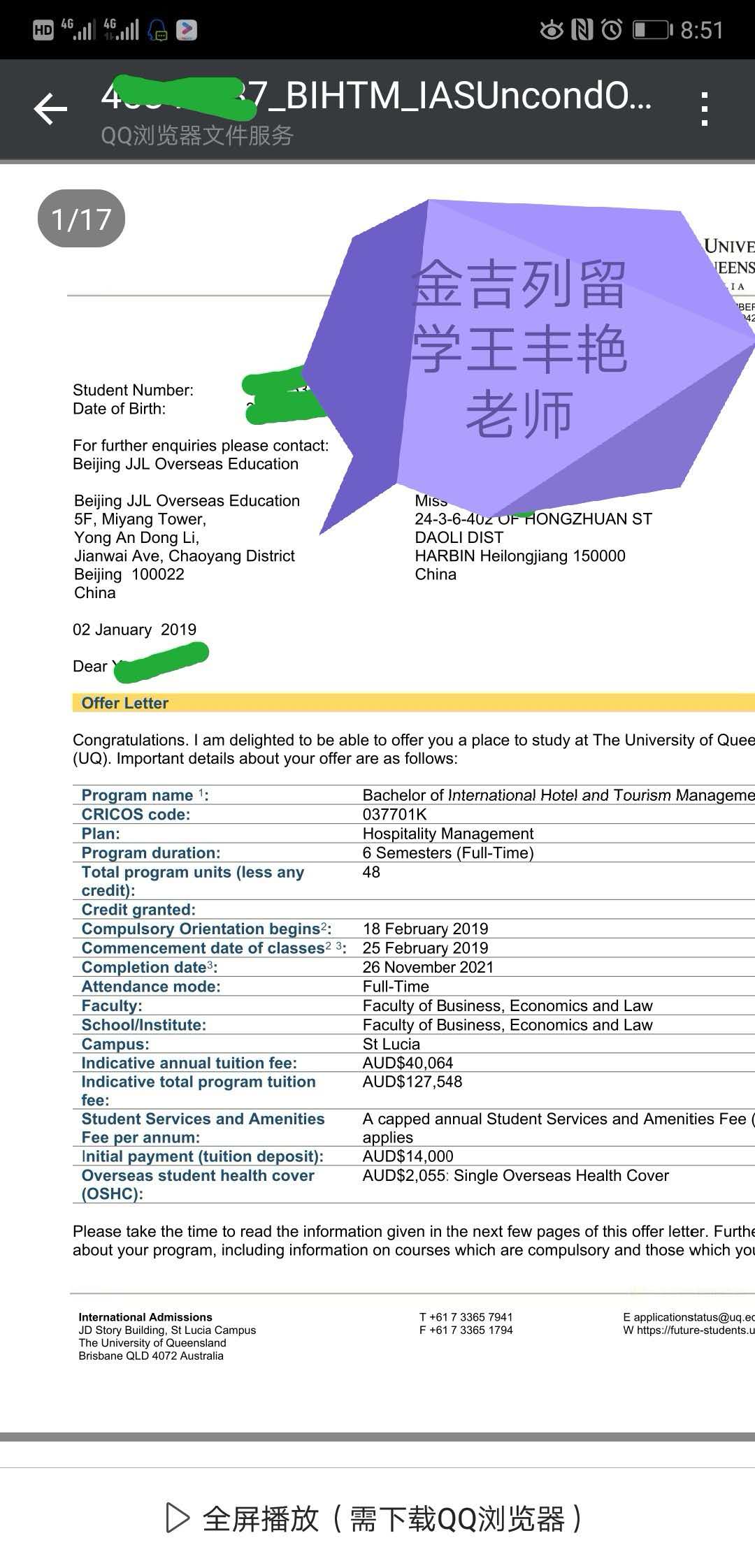 等待的这些天,家长很焦虑,我们深知目前是澳洲放假的时间不可能有结果出来,所以不停的安慰家长,耐心的等待学校开学审理。就在元旦后第一天上班,前一刻妈妈还在问有没有结果,下一刻我们就收到了昆大的录取通知书,无条件录取!家长在收到通知书那一刻,高兴的感谢我好几次!