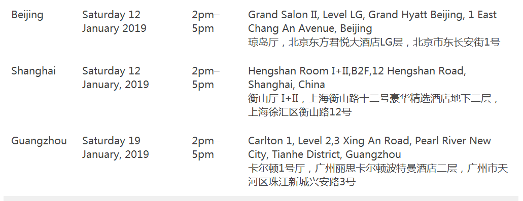 墨尔本大学中国办公室将于 1 月 12 日在北京 、 上海, 1 月 19 日在 广州 ,举办 2019 年第一学期新生行前指导。