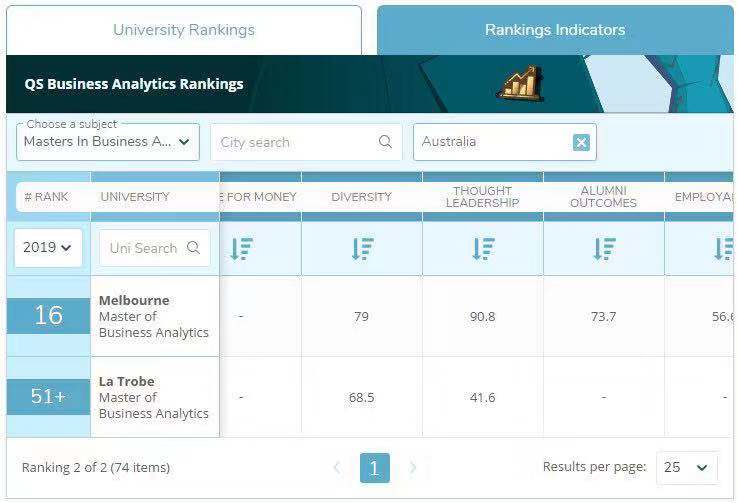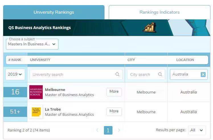 更新的2019年榜单共有74所世界大学上榜,澳洲有墨尔本大学和乐卓博大学榜上有名,对应的专业是Master of Business Analytics 商业分析硕士