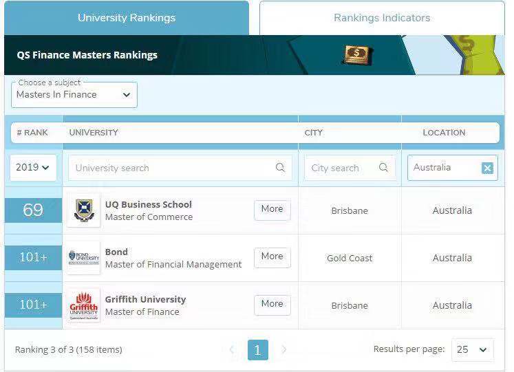 排名最好的是昆士兰大学商学院,对应的专业Master of Commerce,排在第69位;相较于2018年排名51有所下降