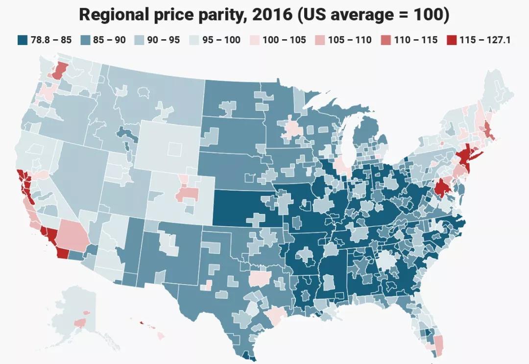例如,纽约大都会区的RPP是122,也就是说纽约的生活成本比全美平均水平高22%;西弗吉尼亚州贝克利的RPP是78.8,也就是说贝克利生活成本只有全美平均水平的五分之四。