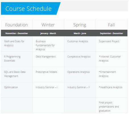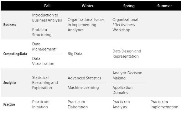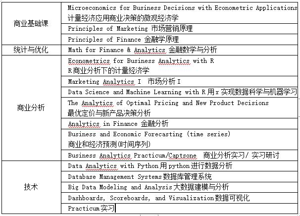 商务分析硕士课程分为四大类:商业基础、统计与优化、商业分析和技术。
