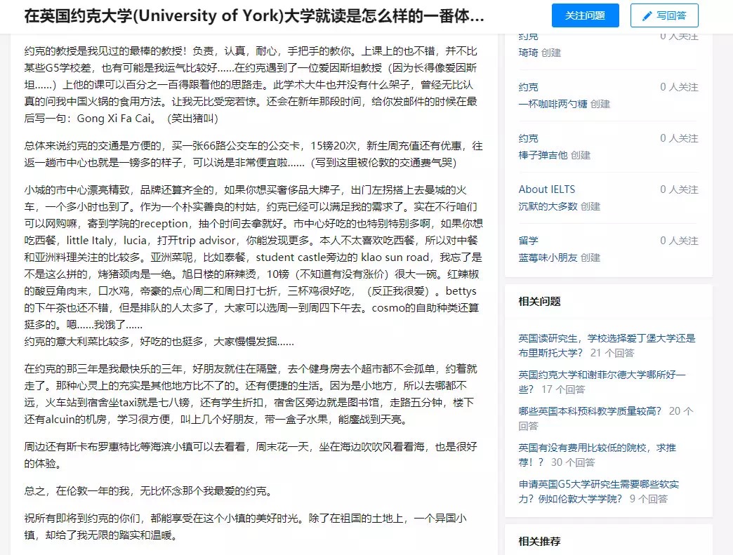 知乎上的一个高赞回答来自约克大学的师姐,她在约克读完本科后到伦敦读了研究生,但还是无比怀念约克的生活,于是又回到约克读了第2个研究生,并且准备在约克定居。