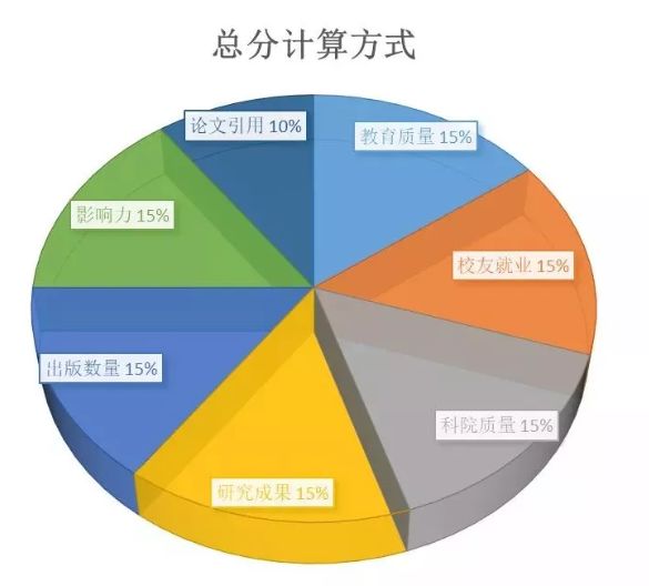 所有大学的总分组成包括:教育质量,就业情况,教师素质,研究成果,出版数量,影响力以及论文引用情况。