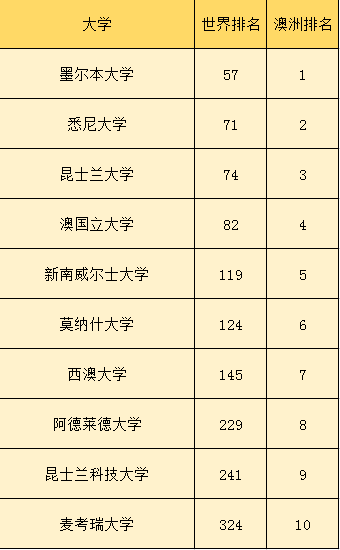 澳洲大学中,墨尔本大学澳洲排名第一,世界排名57。而在QS排名中排名第一的澳国立大学在这个排名中却下排在第四,不得不说,澳国立确实是一个研究型为主的学霸大学,在这种偏实用的排名中有点吃亏。