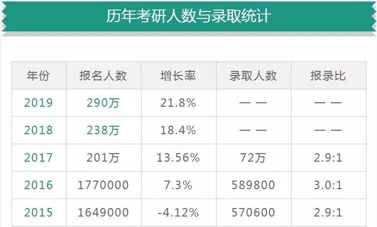 根据《 2019 年全国研究生招生调查报告》显示,全国硕士研究生报名人数强势增长, 2019 年报名人数达到 290 万人,较上一年激增 52 万人,增幅达到 21.8% ,成为近 10 余年增幅最大的一年,也创下改革开放 40 年来最高纪录。