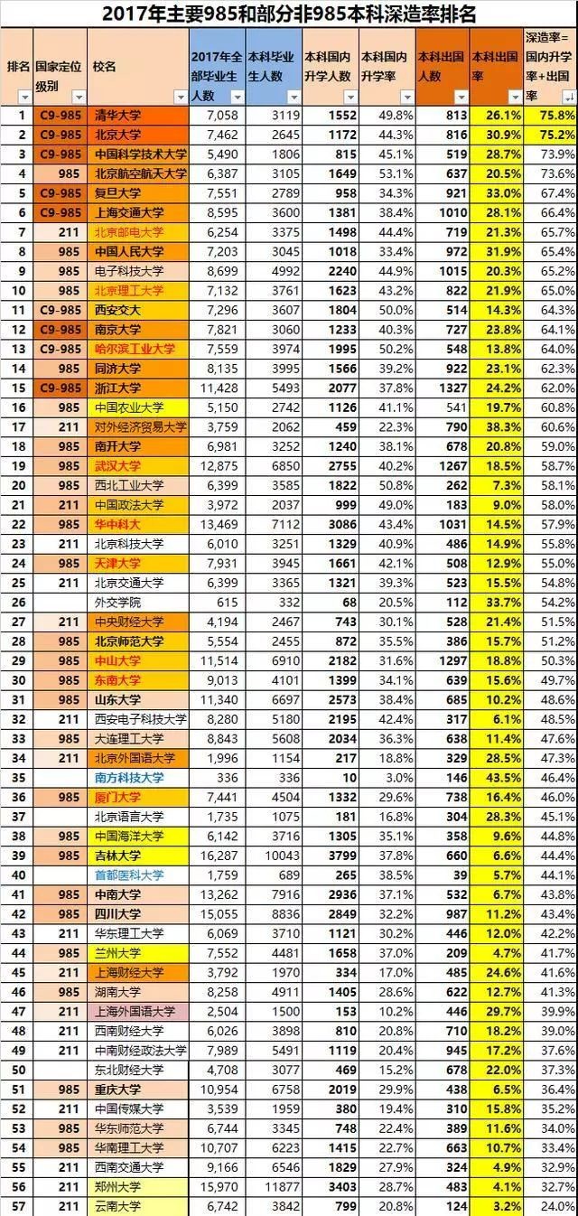 根据 2017 年本科毕业深造率排行表统计发现, 985/211 中国名牌大学中, 深造率最高的是清华大学 75.7% ; 而 北京大学 , 复旦大学 , 中国人民大学 , 对外经贸大学 的本科生出国率都超过了 30% ,其中 985/211 大学出国 比例最高的学校是 对外经济贸易大学 ,大概有 38.3%