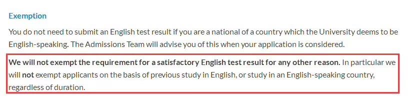 华威大学WMG学院之前政策可以免除在英语国家学习3年或以上的学生的语言能力证明,这类学生可以不用提供雅思或者托福等语言成绩。现在这个免除的政策已经不再有效,所有申请者都必须提供语言成绩(除非申请者是英语国家的国籍)。政策更新是立即生效。