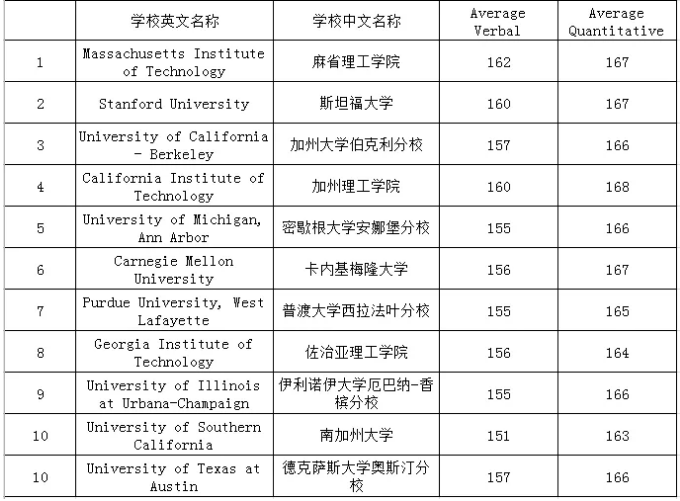当然,总分也说明不了一切。 GRE考试一共包括三个科目:Verbal Reasoning(语言推理)、Quantitative Reasoning(数量推理)、Analytical Writing(分析性写作)。 不同专业的GRE成绩要求是不同的。一般美国人文学科普遍对Verbal的要求比起其他专业要高很多,因为与理工科专业相比,文科专业研究生阶段需要写很多逻辑严密的论文,自然而然就会更注重Verbal的成绩。 而对于那些 申请理工科专业的同学,GRE中的数学部分的成绩就显得非常重要了 。在他们看来GRE中数学成绩的高低直接反映了你的数学能力,像是金融类,统计类专业在招生时就很看重申请人的数学能力,所以在他们看来Verbal分数就没那么重要了,平均只要达到150分以上就足够了。不过想要 申请去到顶尖名校的话, 就算是理工科的专业, Verbal成绩最好还是要 达到160分以上,这样才会提高自己的录取概率。 以工程学院为例,讯哥为大家列举了2018年排名前十的各大院校中工程学院录取学生的单项平均成绩,大家可以参考一下。