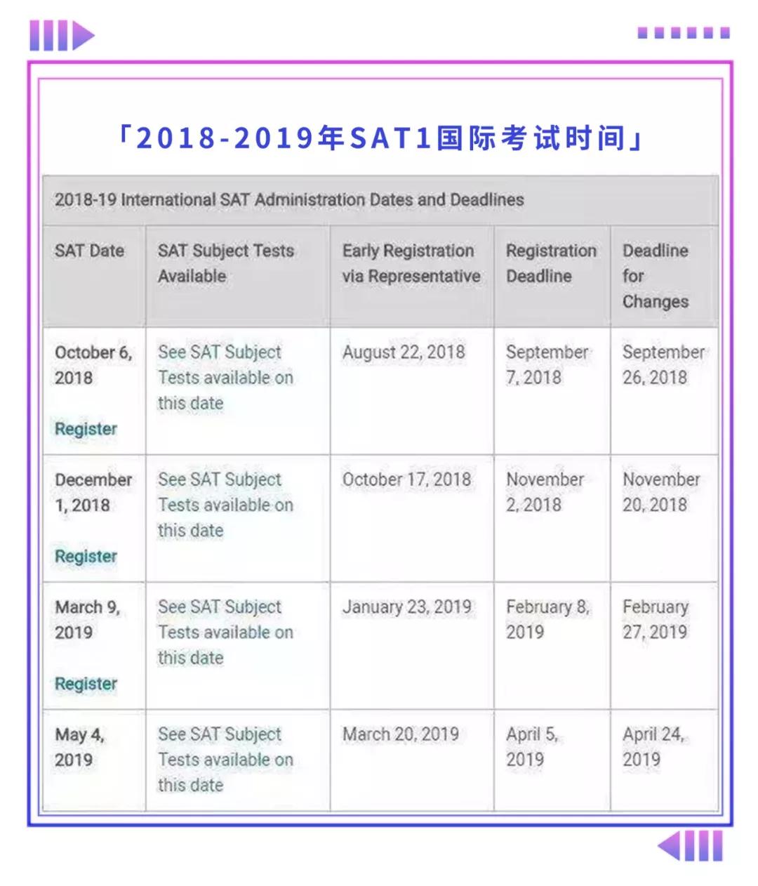 2018年-2019年SAT1国际考试时间如下: