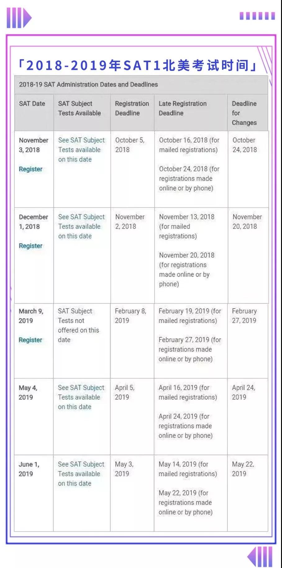 2018-2019年SAT1北美考试时间如下: