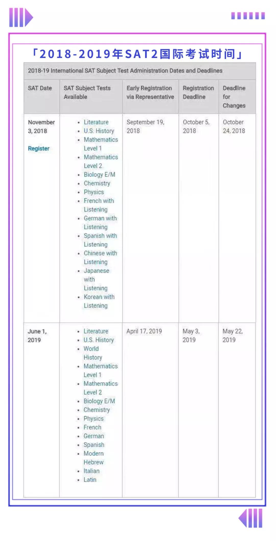 2018-2019年SAT2国际考试时间如下: