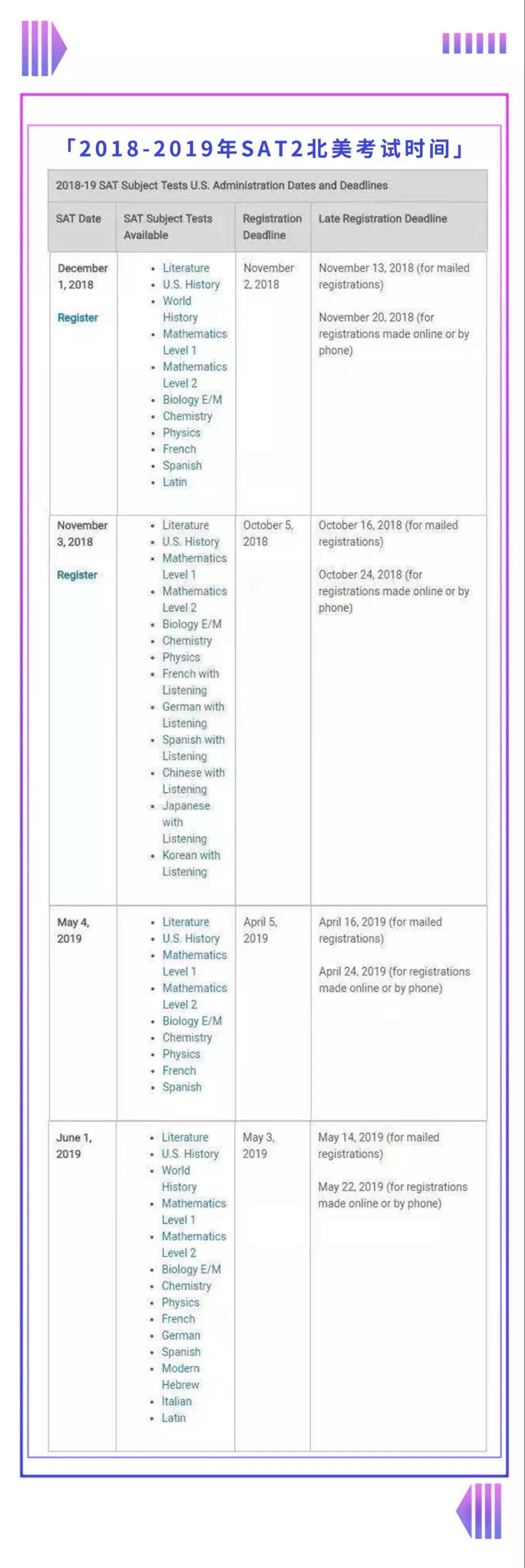 2018-2019年SAT2北美考试时间如下: