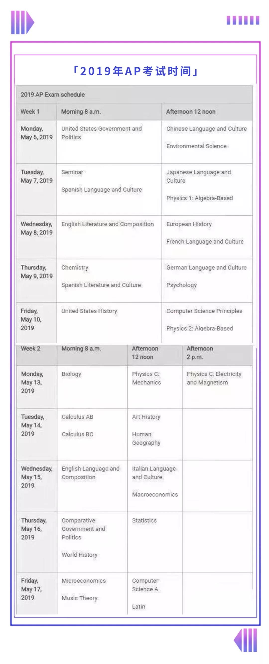 AP成绩不但可以抵扣成功申请美国大学的同学入学后相应课程的学分,而且AP成绩也成为美国各大学录取学生的重要依据。 美国政府、环境科学等科目在第一天考试,艺术史变为在第二周考试。