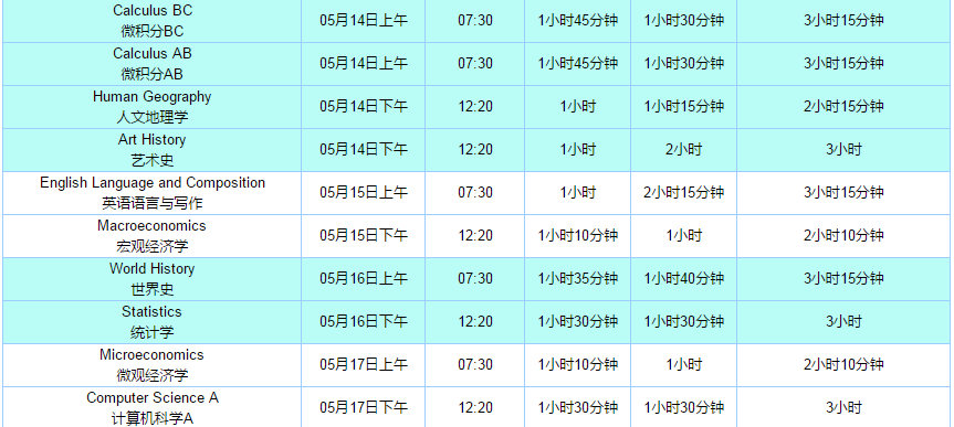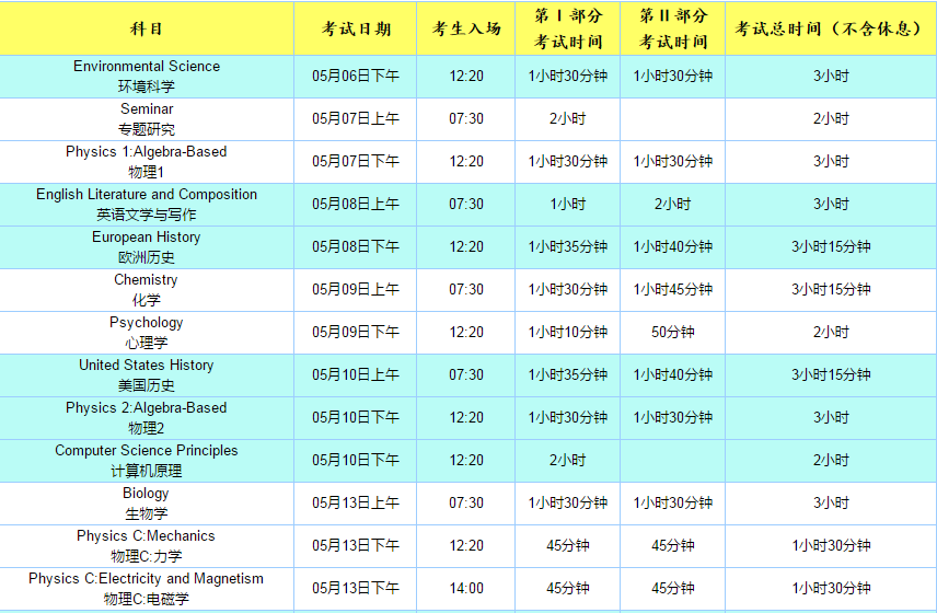 AP考试每年一次,为期两周,被安排在5月进行。每门课的考试时间约2-3个小时。