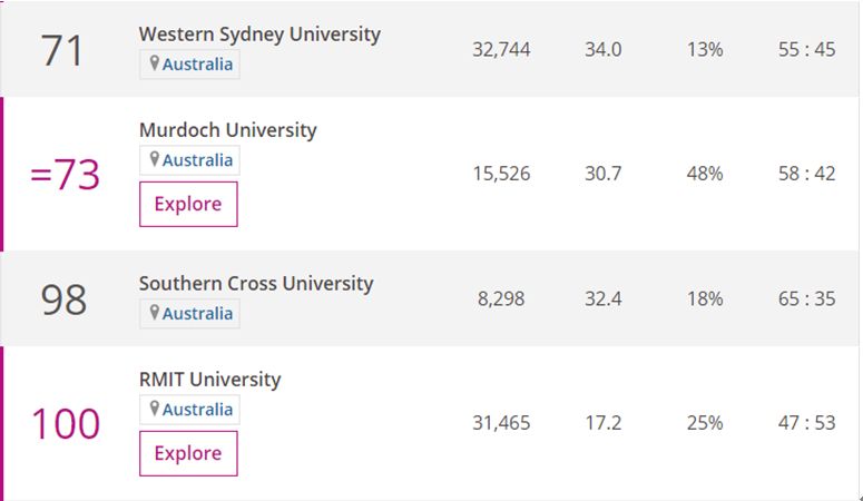 在前50名之中,澳大利亚有8所大学入选。其中,悉尼科技大学和昆士兰科技大学挺进了前20,分别排名第16和第20。南澳大利亚大学、詹姆斯·库克大学、伍伦贡大学、格里菲斯大学、查尔斯·达尔文大学、迪肯大学分别取得了第26、28、32、37、43、50的好名次。另有8所大学位列50—100名之间,它们依次是维多利亚大学(53)、堪培拉大学(58)、斯威本科技大学(65)、科廷大学(68)、西悉尼大学(71)、默多克大学(73)、南十字星大学(98)、墨尔本皇家理工大学(100)。
