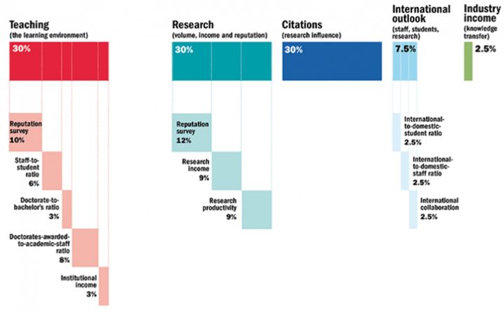 其中,教学占评分的30%,该方面包括教学声誉(10%)、师生比(6%)、博士与学士比例(3%)、教职工博士学位比例(8%)、机构收入(3%)5项指标。研究占评分的30%,该方面包括研究声誉(12%)、研究收入(9%)、研究效率(9%)3项指标。引文占评分的30%。国际视野占评分的7.5%,该方面包括国际学生比例(2.5%)、国际教职工比例(2.5%)、国际合作(2.5%)3项指标。此外,行业收入占评分的2.5%。
