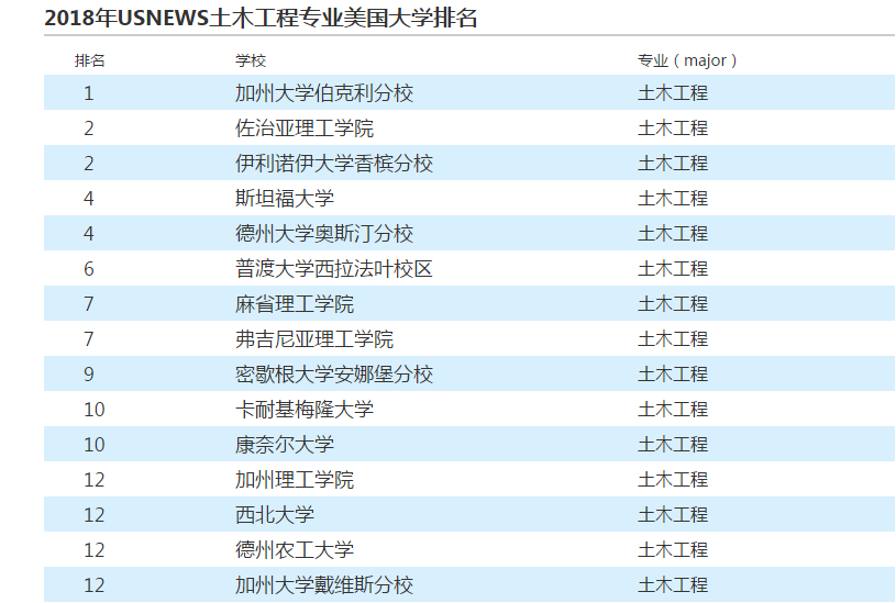 •在工程学院下 设置土木与环境工程学系 ,如加州大学伯克利分校、伊利诺伊大学香槟分校和麻省理工学院。这些学校的土木与环境工程学系与工程学院的其他系科(如化学工程、电气工程等)紧密结合,从事边缘和交叉学科的研究。 •美国土木与环境工程专业一般设立工程学院之下,包含结构工程、力学工程、交通运输工程等多个学科领域,因此申请时选择的余地较其他专业更宽。