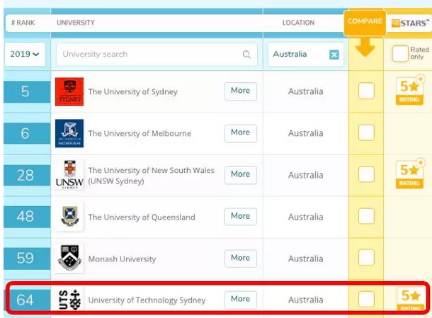 在此次排名中,悉尼科技大学位列全球 64 名,上升 5 个名次,在澳大利亚高校中名列第六,一不小心进了“八大”。