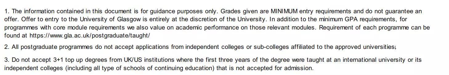 资料仅供参考。给出的绩点要求均为最低入学要求,且不保证一定会被录取。格拉斯哥大学的录取通知完全由格拉斯哥大学自行决定。对于有核心课程模块要求的课程,我们不仅要求最低平均绩点,也非常重视相关核心课程的学术表现。具体每个项目的的要求可以在https://www.gla.ac.uk/postgrauate/taught/找到
