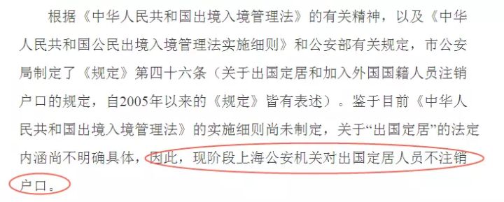 不过在24日“上海发布”公众号对政策进行了进一步解读。其中表示——近段时间来,大家对《上海市常住户口管理规定》十分关注,参与度很高,比如,有的对《规定》如何有效实施提了很好的意见建议,有的对《规定》中一些条文如何理解表达了疑问。鉴于目前《中华人民共和国出境入境管理法》的实施细则尚未制定,关于“出国定居”的法定内涵尚不明确具体,因此,现阶段上海公安机关对出国定居人员不注销户口。