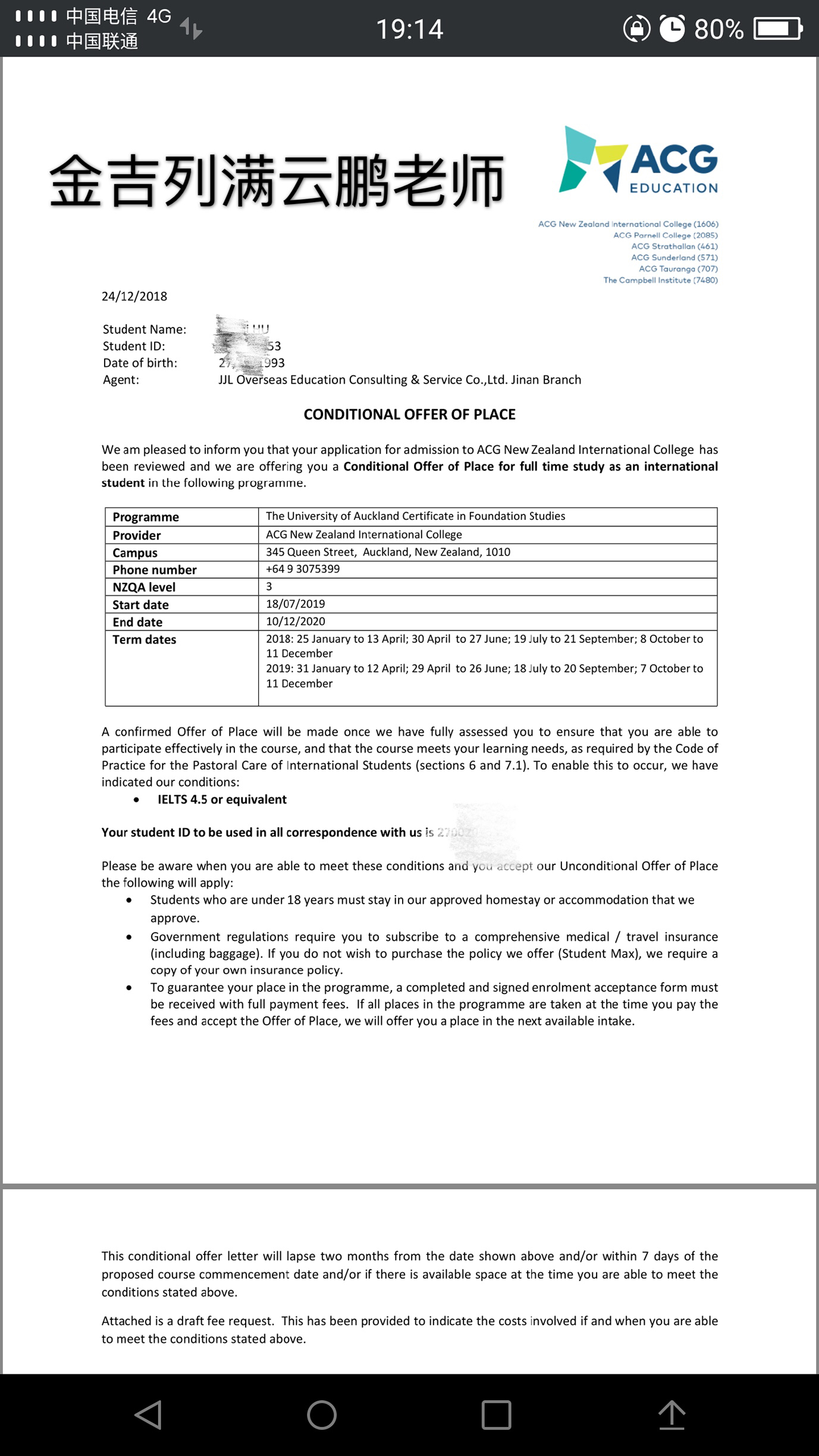 最终结果:成功拿到语言课加预科加主课的录取,只要顺利通过语言课和预科课程,可以进入世界排名85位的学校