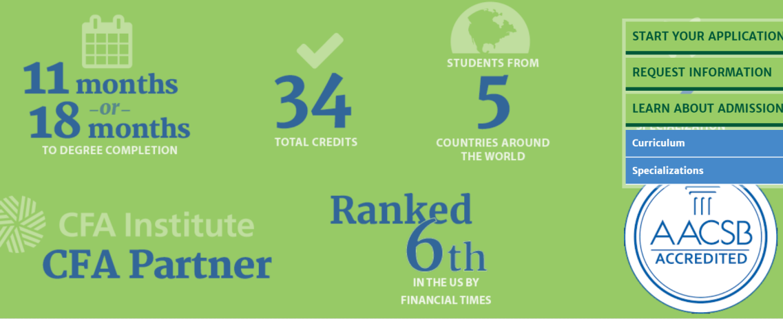 专业的课程是11个月或者18个月,毕业需求34个学分,AACSB认证International (The Association to Avance Collegiate Schools of Business International) 【国际商管学院促进协会】,CFA合作,全美排名第6.