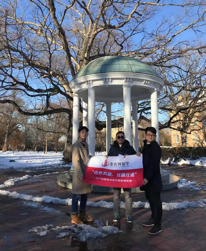 金吉列留学代表团在北卡教堂山“老井”前合影 金吉列留学常务副总裁郑应文(中) 金吉列留学美国院校合作部经理孙博(右) 金吉列留学美国院校合作部项目专员李晓雨(左)