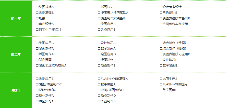 绘画,动漫脚本,角色设计,插图制作等都会涉及。所以学制稍长。