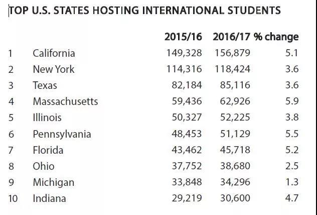根据美国国际教育部发布的《国际教育交流开放门户报告》,在2016-2017学年,美国最最热门的留学地区是 加州 和 纽约 , 德州 的留学生人数也在增长。