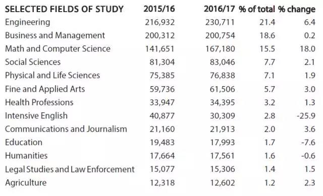 工程 、 商科 和 CS 是留学生最爱的三大支柱专业。有超过一半的留学生选择此类专业。人数增加最多的依然是火爆的CS专业,增幅高达18%。