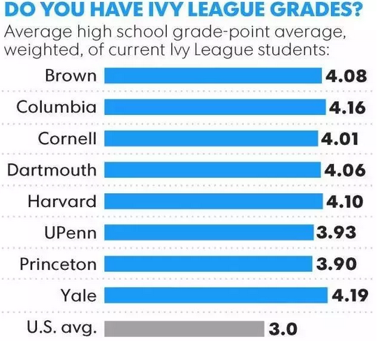 以下是被录取的藤校学生高中GPA平均分数: