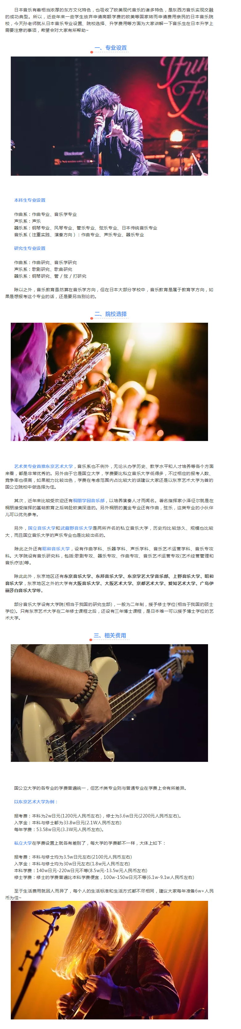 日本音乐有着相当浓厚的东方文化特色,也吸收了欧美现代音乐的诸多特色,是东西方音乐实现交融的成功典型。所以,近些年来一些学生放弃申请高额学费的欧美等国家转而申请费用亲民的日本音乐院校,今天郑宇老师就从日本音乐专业设置、院校选择、升学费用等方面为大家讲解一下音乐生在日本升学上需要注意的事项,希望会对大家有所帮助~