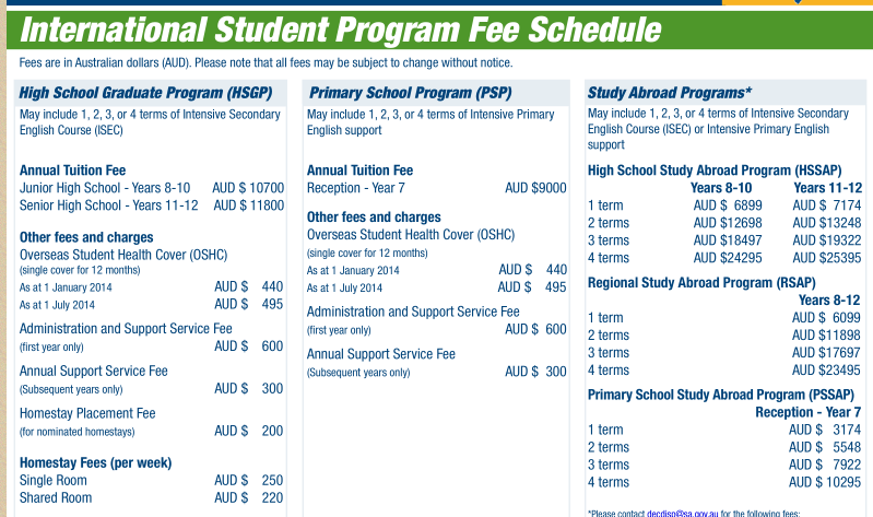 下面为大家推荐一所性价比较高的中学。 南澳州欢迎来自世界各地的莘莘学子。这里不仅为您接受国际公认的高质量教育提供独有的机会,同时您还会有机会练习语言、感受生活和欣赏她的美丽。 南澳州首府 Aelaie 人口约 120 万。 城市精心规划,绿地环绕,堪称是世界上最美、最宜居的城市之一。中心城市之外,郊区从 Aelaie 山麓一直延伸到大海边。 Aelaie 生活极为方便,而且消费要大大低于澳洲其它城市。 南澳州还拥有世界一流的教育设施,既有中学、职业教育培训学院,也有国际知名的大学。总之, Aelaie 可为您的海外留学生活提供完整的服务。 The Department of Eucation an Chilren ’ s Services (南澳州政府教育部)在 Aelaie 阿德莱得)市和整个南澳州地区精选出多所学校参与国际教育并给予这些学校以大力的支持。南澳州政府公立学校的学校校园宽敞,环境自然、幽美。学校教学资源丰富,所有课程均辅以信息技术。有些学校还设有特殊兴趣项目,例如,科学、数学、设计、音乐、体育和表演艺术等。南澳州政府(公立)学校关爱所有学生并为之提供高水准服务,其中包括:重视不同的需求、为高年级学生设计个性化的学习方案、为天资优秀学生提供特别的帮助以及对学生的未来发展给予指导。 南澳地区学费和生活费相对低廉,是近几年家长的主要选择地。见下图: