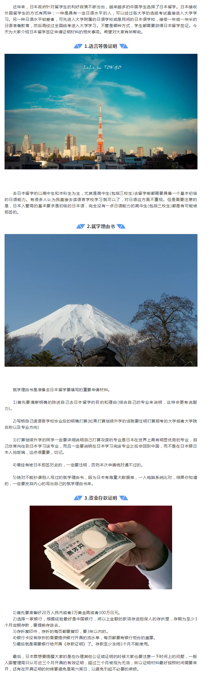 近年来,日本政府针对留学生的利好政策不断出台,越来越多的中国学生选择了日本留学。日本接收外国留学生的方式有两种:一种是具有一定日语水平的人,可以经过各大学的选拔考试直接进入大学学习。另一种日语水平较差者,可先进入大学附属的日语学校或是民间的日本语学校,接受一年或一年半的日语准备教育,然后再经过全国统考进入大学学习。不管是哪种方式,学生都需要获得日本留学签证。今天为大家介绍日本留学签证申请证明材料的