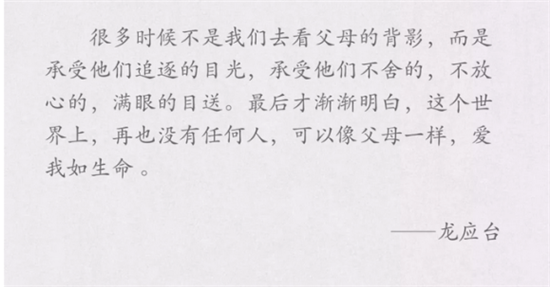 这不禁让人想起龙应台在《目送》里写的那段话:“我慢慢地、慢慢地了解到,所谓父女母子一场,只不过意味着,你和他的缘分就是今生今世不断地在目送他的背影渐行渐远。你站在小路的这一端,看着他逐渐消失在小路转弯的地方,而且,他用背影默默地告诉你,不必追。”