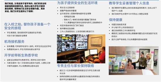 2、安全的校园生活环境。二十余名训练有素的安保人员监控巡视所有校区及宿舍,确保学生安全;专设中央监控中心,高清监控摄像头全方位覆盖校园及宿舍,安保人员24/7实时监视。