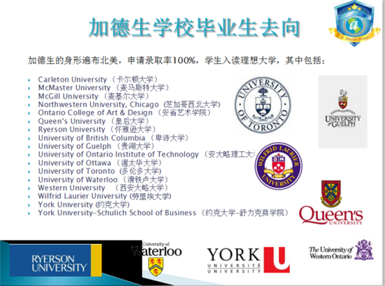 - 成立于2002年,位于加拿大安大略省多伦多万锦市。百分之百的优秀大学录取率:一流的教育环境,加上经验丰富的教育顾问支持,造就了毕业生100%申请到满意的大学。