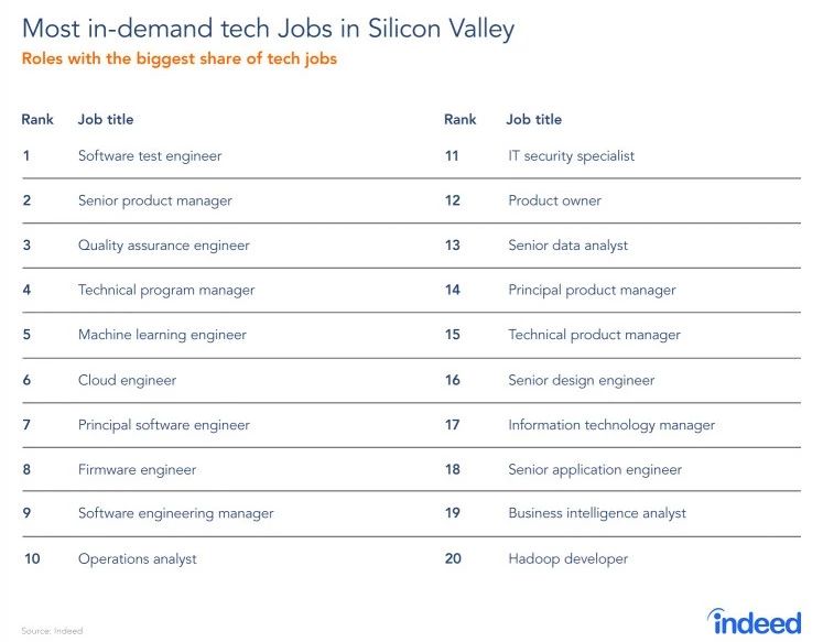 美国劳工部统计,科技占美国经济所有就业岗位的10%,规模庞大,其中硅谷占了大头。招聘服务网站Inee调查发现,2017年11月-2018年11月,硅谷技术职位发布率上升了12.9%。 在硅谷所有技术招聘中,软件测试工程师缺口最大 (去年排名第8) ,其次是高级产品经理,商业智能分析师、Haoop 开发则相对没那么火热。