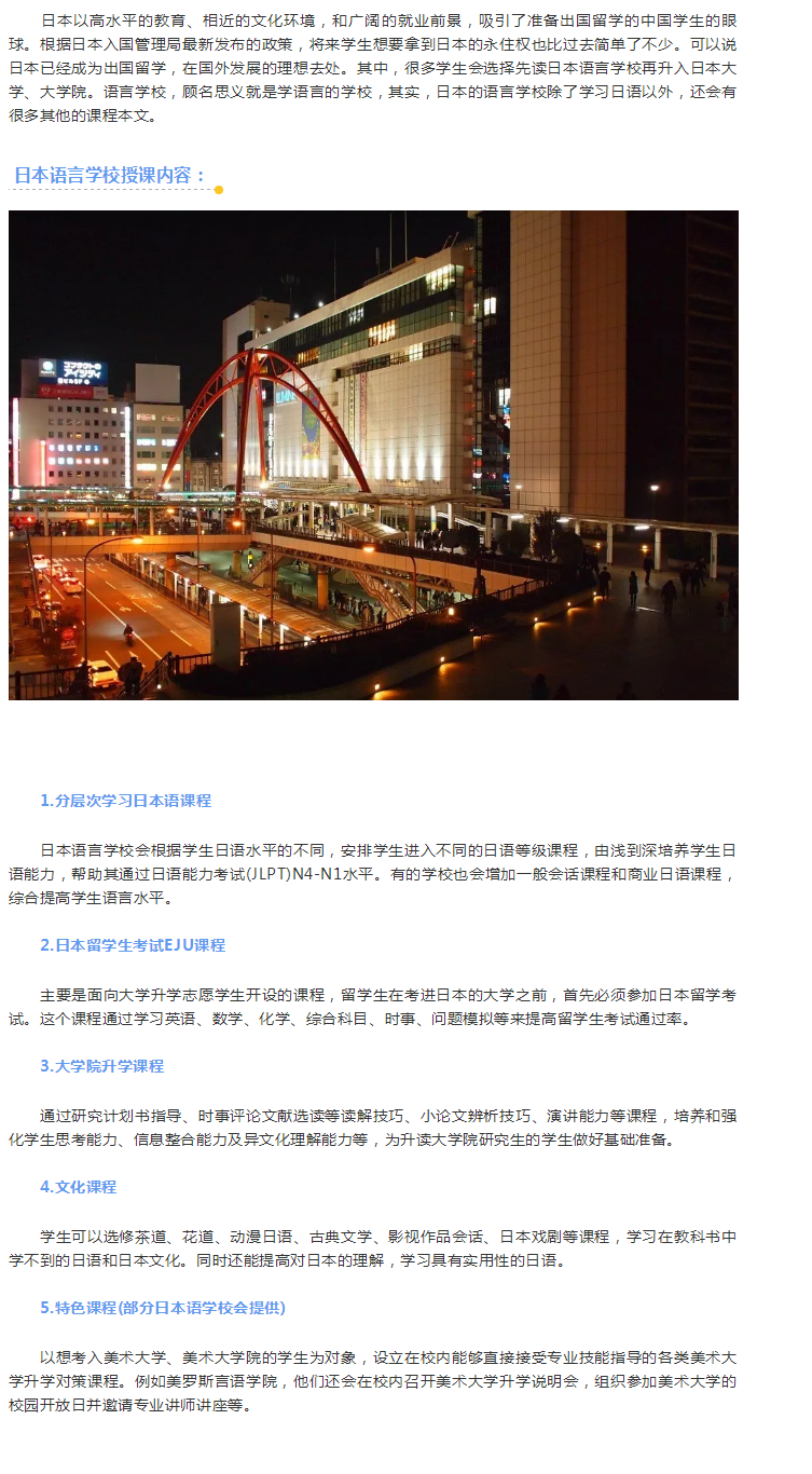日本以高水平的教育、相近的文化环境,和广阔的就业前景,吸引了准备出国留学的中国学生的眼球。根据日本入国管理局最新发布的政策,将来学生想要拿到日本的永住权也比过去简单了不少。可以说日本已经成为出国留学,在国外发展的理想去处。其中,很多学生会选择先读日本语言学校再升入日本大学、大学院。语言学校,顾名思义就是学语言的学校,其实,日本的语言学校除了学习日语以外,还会有很多其他的课程本文。