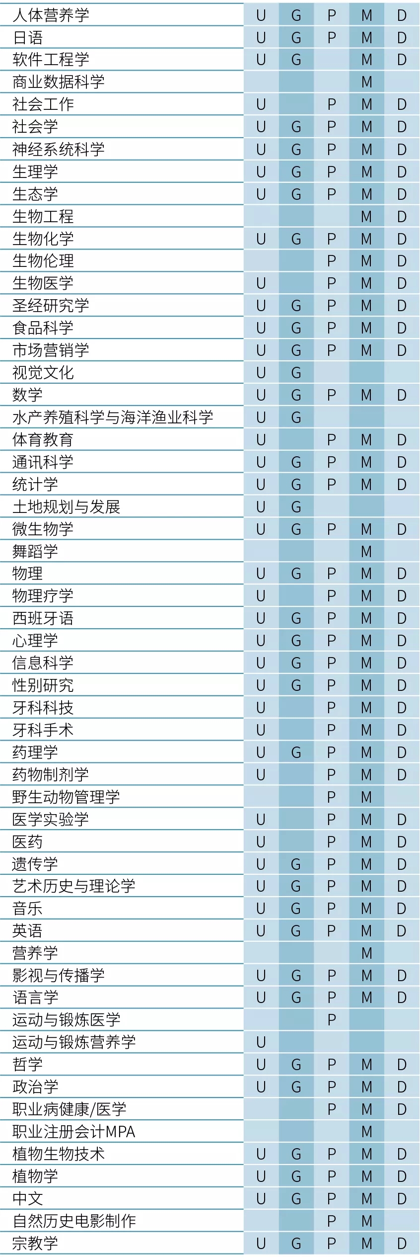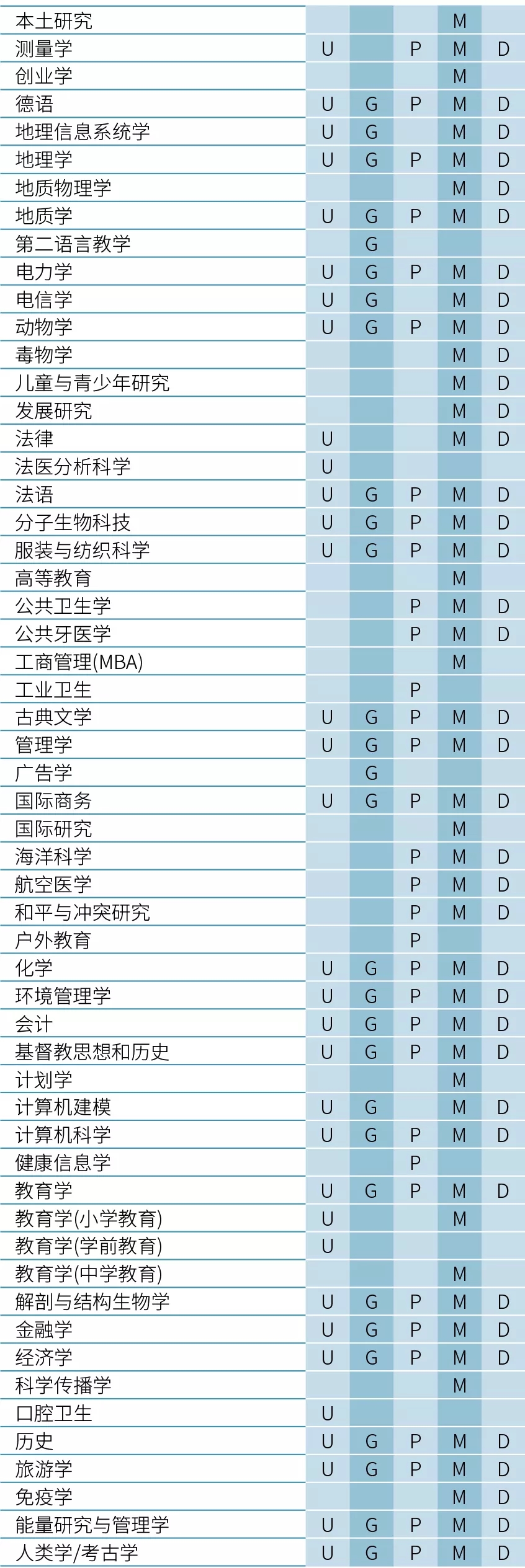开设应用科学、植物学、化学、电脑科学、食品科学、地质学、人体营养学、海洋科学、数学与统计学、物理学、心理学、测量学、动物学、体育教育学等专业。