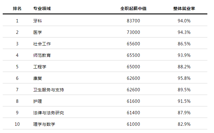 本科毕业生中,整体年薪中值 最高 的是牙科毕业生,其次是医学毕业生,之后是社会工作毕业生。