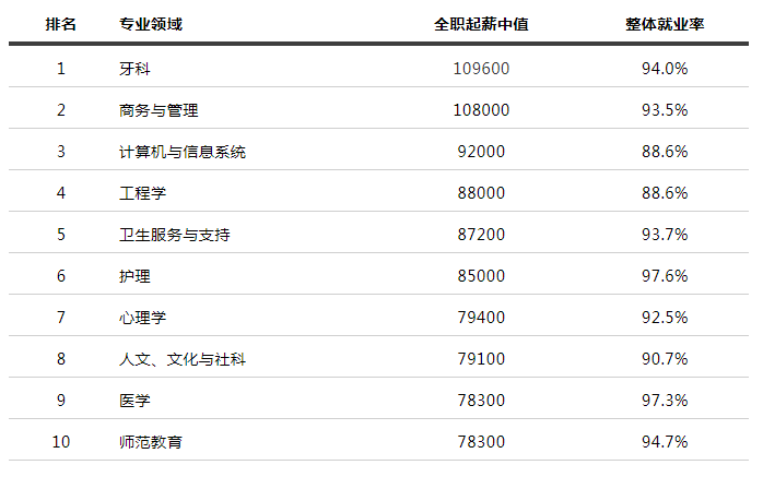 硕士毕业生中,整体年薪中值 最高 的仍然是牙科毕业生,其次分别是商务与管理、计算机与信息系统的毕业生。