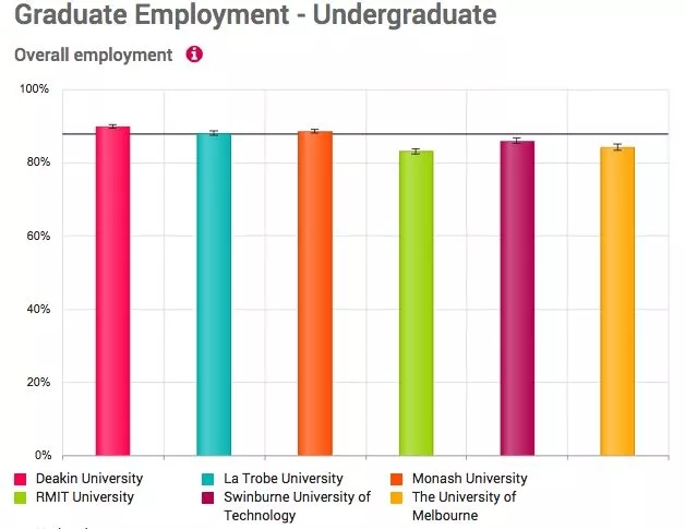 迪肯的本科毕业生综合满意度、本科教学满意度、本科整体就业率在墨尔本各高校中脱颖而出,都是第一名哦~!五星级大学,不是盖的!