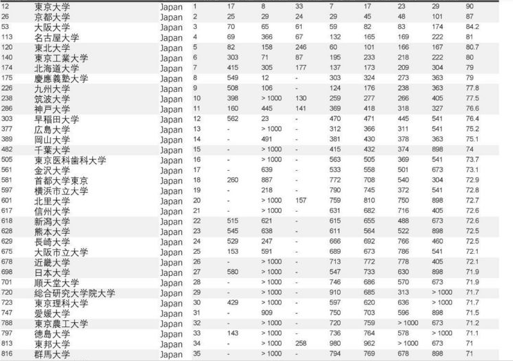 日本方面,则有 3 所大学入围了 TOP100 ,东京大学 12 名( 13 )、京都大学 26 名( 21 )和大阪大学 53 名( 50 )排名变化不大,但数量却大幅减少,神户大学 286 名( 32 ) 早稻田大学 303 名( 37 )东北大学 120 名( 88 )均跌出了 TOP100 * 括号内为去年排名