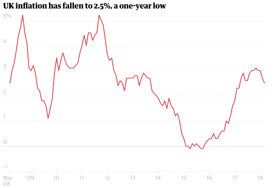 脱欧投票结果让英国的通货膨胀猛增,导致欧盟敲定了英镑的价值并推高了进口成本。不过,英国国家统计局(Office for National Statistics)的数据显示出英国退欧公投对家庭财政影响的最新迹象表明,3月份消费者价格指数(CPI)已从11月份的5年至高点3.1%跌至2.5%,