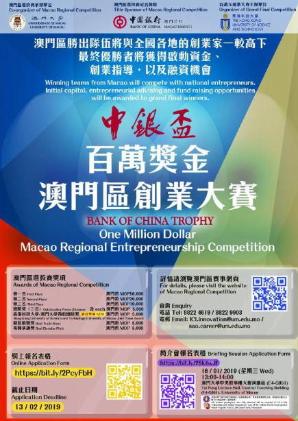 澳門大學“中銀盃百萬獎金澳門區創業大賽”現正接受報名,歡迎澳門大專院校在讀學生及海外就讀大專院校的澳門居民參加,截止日期至2月13日。澳門區選拔賽獎金達十二萬澳門元,首三強將晉級總決賽,有機會贏取百萬元人民幣獎金,更可能獲得超過五千萬的融資機會。