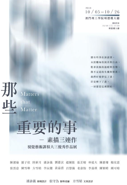 澳门理工学院视觉艺术课程三年级优秀作品展“那些重要的事-素描三连作”展览已于上周五(10月5日)在理工学院明德楼大堂展览厅开始展出,开幕仪式及茶会谨定于本月10日下午五时三十分在上述地点举行,展期至本月26日。