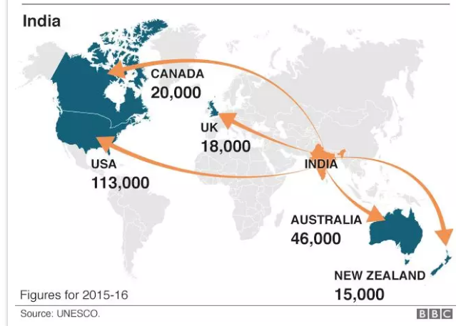 下图是当今世界上最大的两个留学生输出国——中国和印度的留学数据。2015-16年,中国去澳洲留学的人数11.2万,已经超过英国的9.2万。而印度人对澳洲留学更感兴趣,赴澳留学人数是赴英的近3倍。